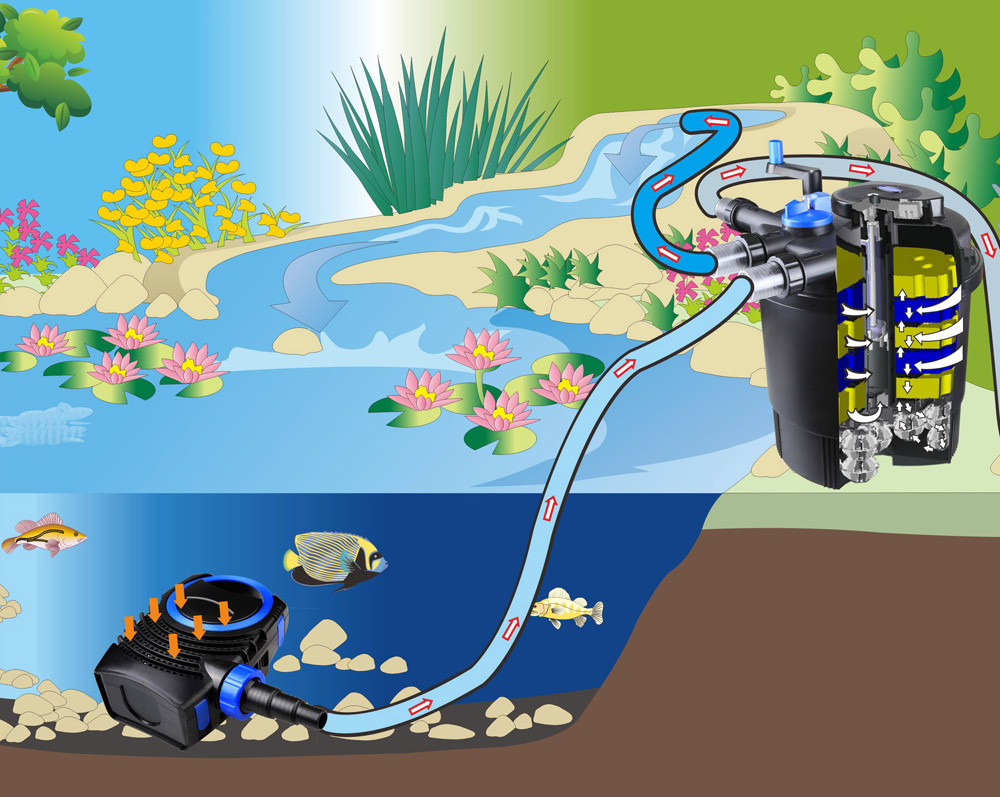 Напорные фильтры - идеальный вариант для водоемов с горками, ручьями и при создании многоуровневых водоемов. Могут устанавливаться ниже уровня воды, что решает проблему их декорирования. Благодаря напорным фильтрам, уже очищенная вода может подаваться выше установленного фильтра, например, на горки и водопады. Для очистки воды используется три компонента: фильтрующие маты различной зернистости, UV-лампа, убивающая вредные болезнетворные бактерии и снижающая степень цветения воды, биоблоки, на которых размножаются полезные бактерии. Наличие функции «ОБРАТНОЙ ПРОМЫВКИ» облегчает обслуживание фильтра