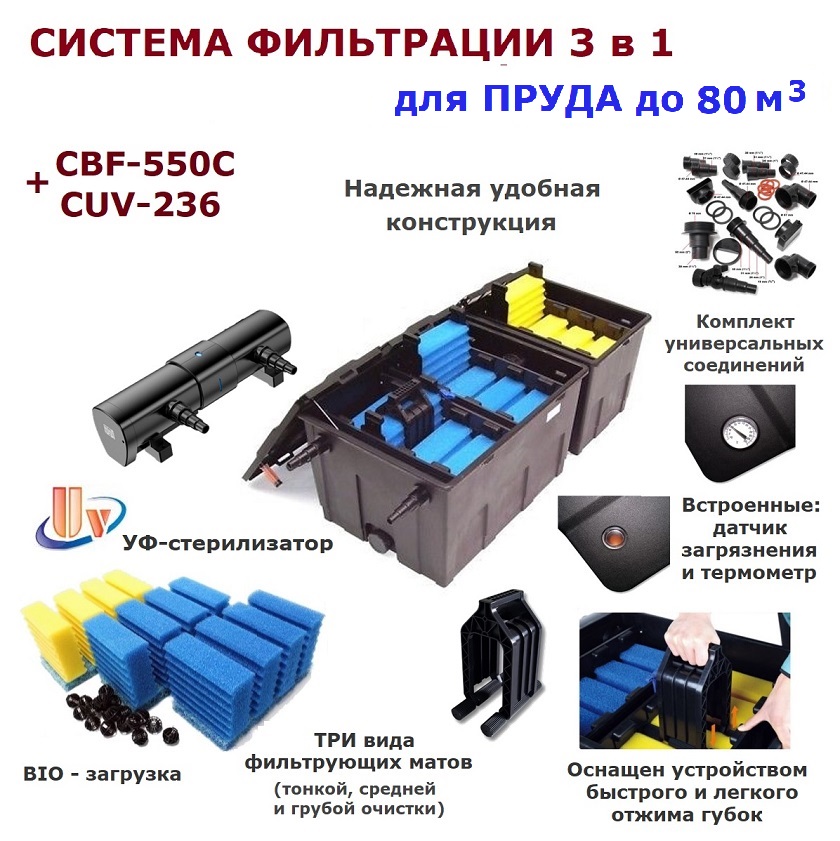 Пропускная способность до 12000 л/ч. В комплект входит УФ-фильтр CUV-236, мощностью 36W и насос производительностью 10000 л/ч. (При желании увеличить производительность фильтра, UV-лампа может заменяться на более мощную) Имеет индикатор загрязнения, термодатчик и систему легкой промывки фильтрующих матов.